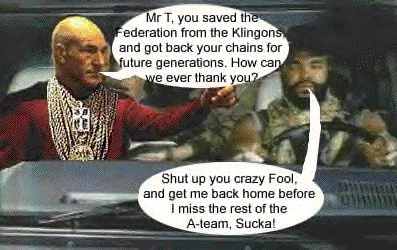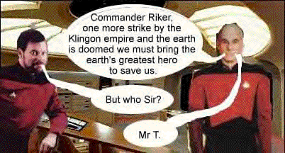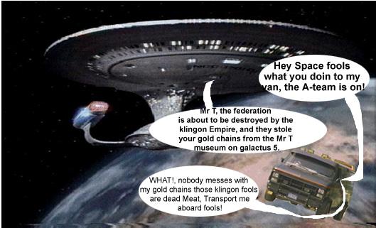 Late in the 23rd century, the federation is embroiled in a war with the Klingon empire, one which they are severely losing. Realizing this, the crew of the USS Enterprise knows that the only one who can save them now is Mr T.